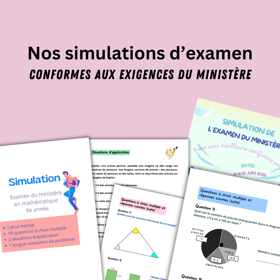 Offrez une préparation optimale à vos élèves avec nos simulations d’examen en mathématiques ✏️📚 ! Fidèles à la structure et à la difficulté de l’épreuve du ministère, elles couvrent toutes les notions de 6e année en mathématiques pour une révision complète et efficace.